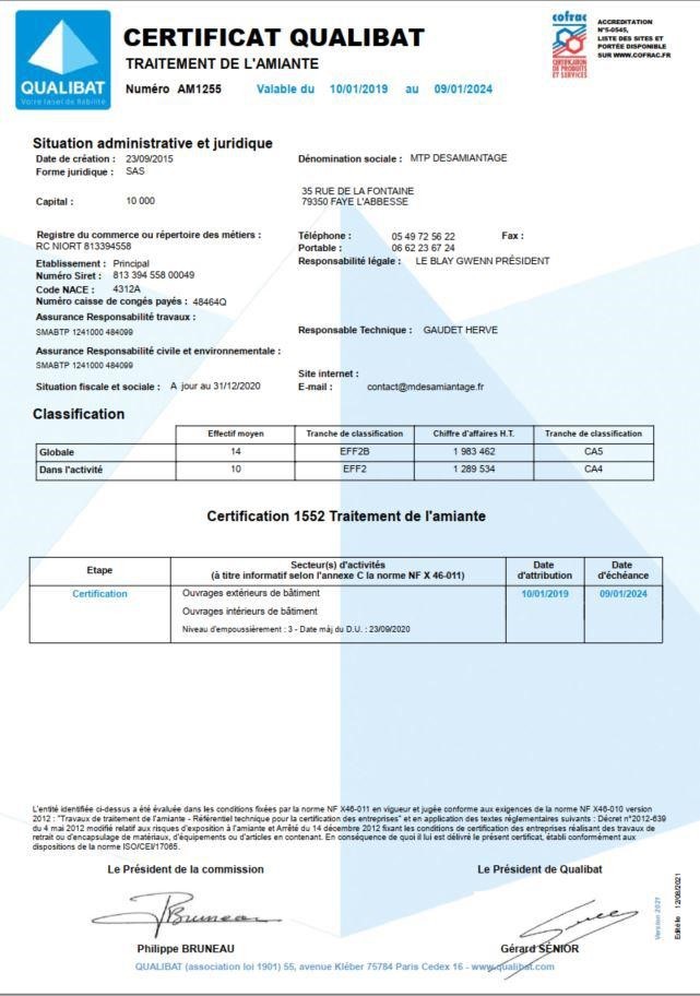Elles sont certifiées Qualibat pour les travaux de retrait d'amiante en extérieur, en intérieur, sur les ouvrages d'assainissement et les installations industrielles.
